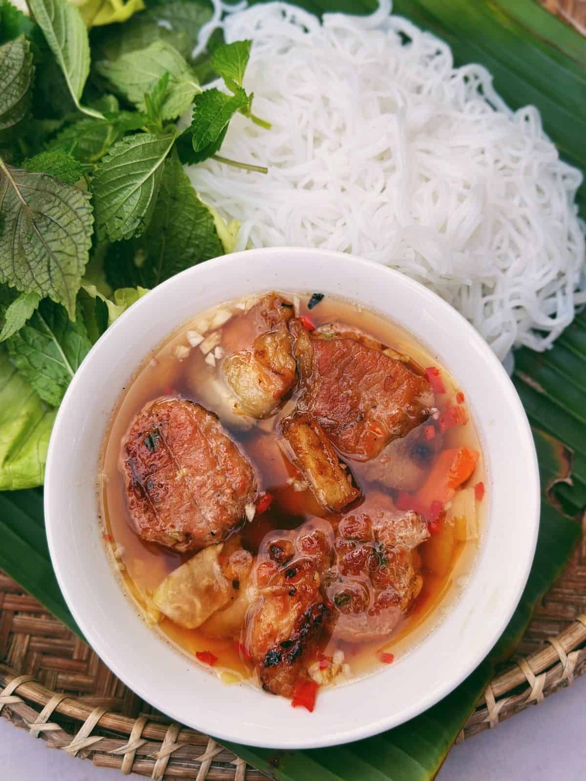 Charcoal-grilled pork patties and caramelized pork belly are served with rice vermicelli, a sweet-savory dipping sauce, fresh herbs, and pickled vegetables. President Obama famously tried this dish during his 2016 Hanoi visit.