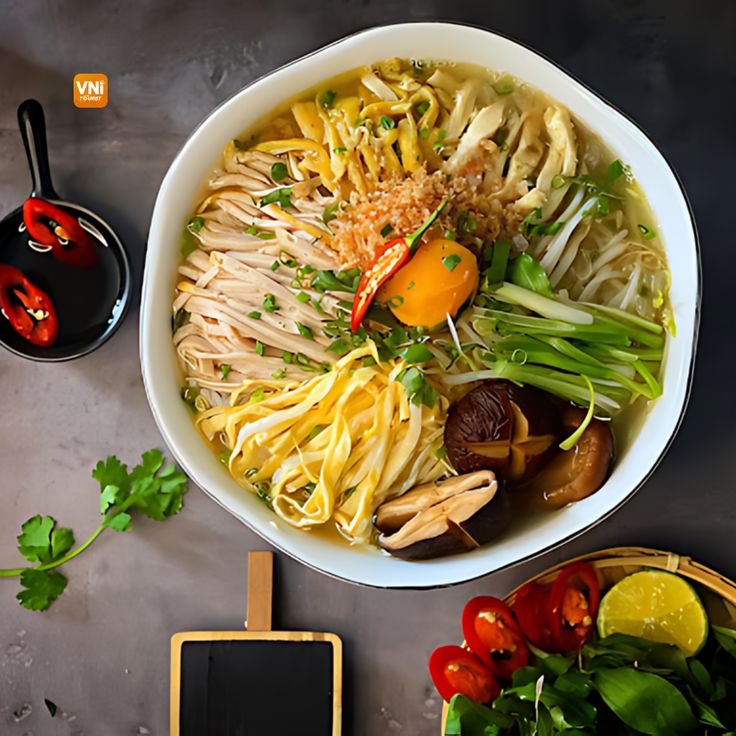 A delicate, clear broth made from chicken and dried shrimp, served with thin rice noodles, shredded chicken, omelet strips, and fragrant herbs. Elegant and comforting.