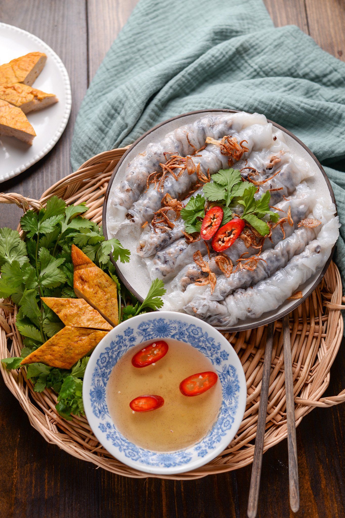 Delicate sheets of rice batter are filled with minced pork and wood-ear mushrooms, then topped with crispy shallots. Dip them in a warm fish sauce blend for a light but satisfying meal.